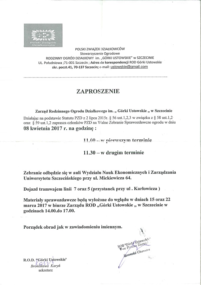 Zarząd Rodzinnego Ogrodu Działkowego im. „Górki Ustowskie” w Szczecinie zawiadamia, że