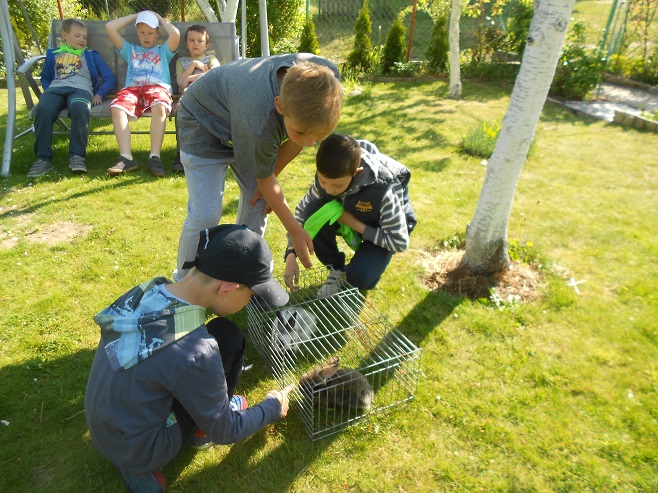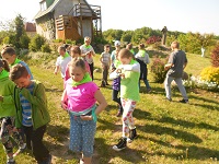 Pobyt uatrakcyjniają zaproszenia na działki, gdzie  Dzieci oglądają kury, króliki, zarybione oczko wodne z mnóstwem żabek.