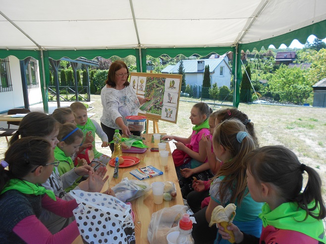 Na spacer po ogrodzie, zajęcia o przyrodzie, ognisko i zabawę, zaprosiła dzieci  instruktor ogrodowy Ewa Rogala.