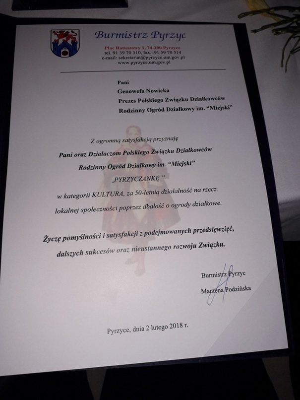 Wyróżnienie w postaci dyplomu i statuetki „Pyrzyczanka” – w kategorii „Społecznik”, za 50 letnią działalność na rzecz lokalnej społeczności, poprzez dbałość o ogrody działkowe, odebrała prezes zarządu ROD – pani Genowefa Nowicka, która dziękując za wyróżnienie, nakreśliła nowe wyzwania, jakie stoją przed ogrodem.