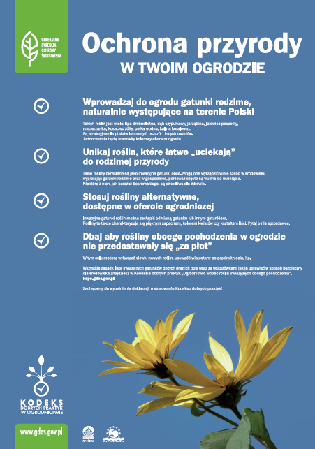 „Ogrodnictwo wobec roślin inwazyjnych obcego pochodzenia” – to tytuł kodeksu dobrych praktyk, który został opublikowany przez Generalną Dyrekcję Ochrony Środowiska. Publikacja ta została stworzona z myślą m. in. o osobach uprawiających własne ogrody, jak również zawodowo zajmującym się ogrodnictwem, osobom którym nieobojętna jest ochrona przyrody i troska o środowisko.