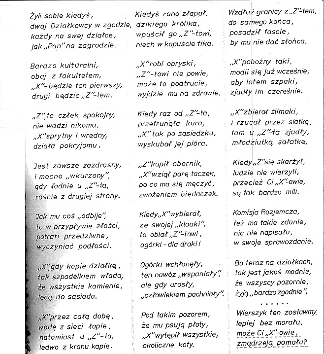 Szanowni Państwo, ktoś musi pilnować porządku w ogrodzie. Trzeba pomyśleć nam wszystkim, jak to zrobić, byśmy wszyscy w ogrodzie czuli się dobrze i żyli w przyjaznej atmosferze. Nawet na prywatnych posesjach obowiązują przepisy porządkowe, nie mówiąc już o kulturze.