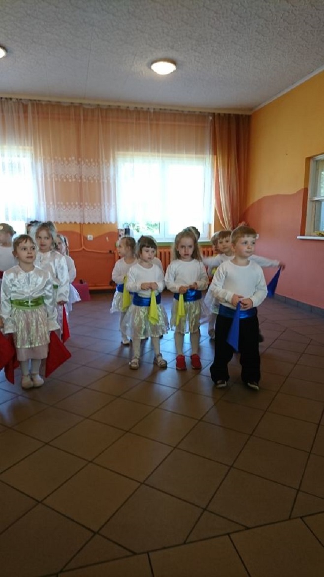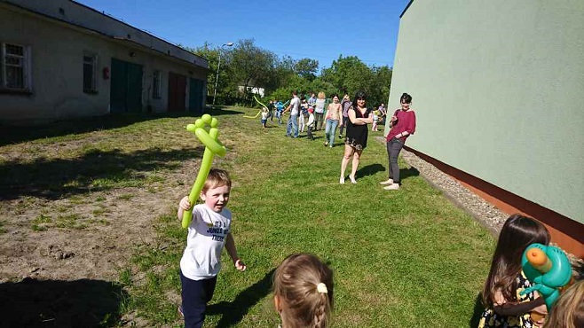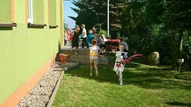 Maluchy roześmiane i rozbawione miło spędziły czas, przy pięknej słonecznej pogodzie, bawiły się, biegały swobodnie po trawie na placu wokół budynku.