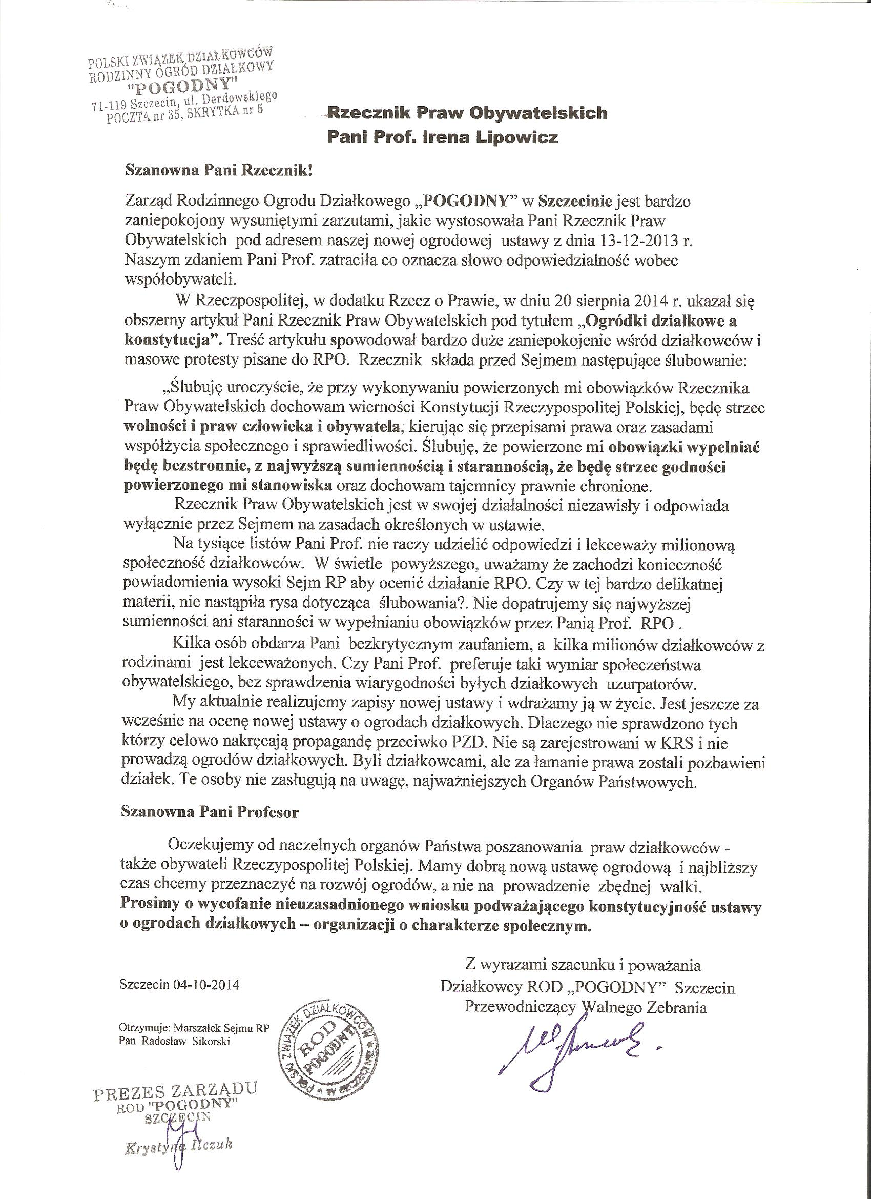 Ponadto podjęto stanowisko ROD „Pogodny” skierowane do Rzecznika Praw Obywatelskich w sprawie wysuniętych zarzutów do naszej nowej ogrodowej ustawy z dnia 13-12-2013 z apelem o wycofanie nieuzasadnionego wniosku podważającego konstytucyjność ustawy o ogrodach działkowych.
