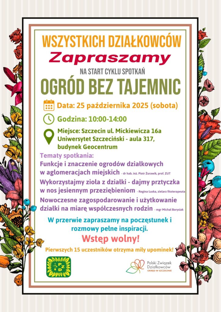 Z przyjemnością informujemy, że Zarząd Okręgu PZD w Szczecinie, we współpracy ze szczecińskimi ROD podjął inicjatywę organizacji cyklu spotkań edukacyjnych pt. „Ogród bez tajemnic”.