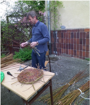 Profesor Andrzej Wyka prezentował wyplatanie z wikliny: