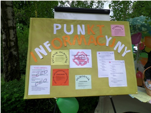 A uczniowie Centrum Edukacji Ogrodniczej przygotowali punkt informacyjny z ulotkami dotyczącymi oferty szkoły i cennikiem sprzedawanych roślin.