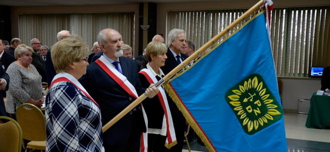 Przewodniczący Zjazdu Tadeusz Jarzębak odczytał uchwałę 8/XII/2017 Krajowej Rady PZD w sprawie nadania sztandaru Okręgowego Zarządu PZD w Koszalinie.