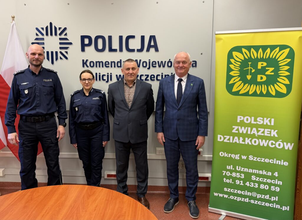 W dniu 7 kwietnia 2026 r. w budynku Komendy Wojewódzkiej Policji w Szczecinie odbyło się spotkanie Zastępcy Komendanta Wojewódzkiego Policji w Szczecinie mł. insp. Mariusza Obsta z Prezesem Okręgu Polskiego Związku Działkowców w Szczecinie Karolem Jakubowskim, przy udziale Przewodniczącego Kolegium Prezesów Szczecin Lewobrzeże Pana Krzysztofa Rosochackiego i podinsp. Moniki Mocianko – Pawlak – Naczelnika Wydziału Prewencji KWP w Szczecinie, poświęcone współpracy w zakresie poprawy bezpieczeństwa na terenach Rodzinnych Ogrodów Działkowych.