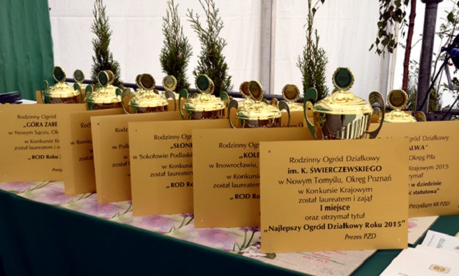 W dalszej części uroczystości nagrodzono wyróżnionych w konkursie krajowym „Wzorowa Działka 2015r.„i laureatów oraz nagrodznych w konkursie „Najlepszy ROD roku 2015„. Wśród wyróżnionych użytkowników najlepszych działek znaleźli się: Dorota i Józef Śmigieł z ROD „Irena„w Inowrocławiu, Regina i Wojciech Kosteccy z ROD „Janowo„w Rumii, Regina i Stefan Kolenda z ROD„Aster„w Opolu, Joanna i Mirosław Kuczyńscy z ROD „Fadom„w Iławie, Gertruda i Jan Wojciechowscy z ROD „100-lecia Zakładów Mięsnych„z Torunia. Użytkownicy tych działek otrzymali dyplomy, nagrody rzeczowe o wartości 500zł oraz wydawnictwa związkowe i roczną prenumeratę miesięcznika „działkowiec„.